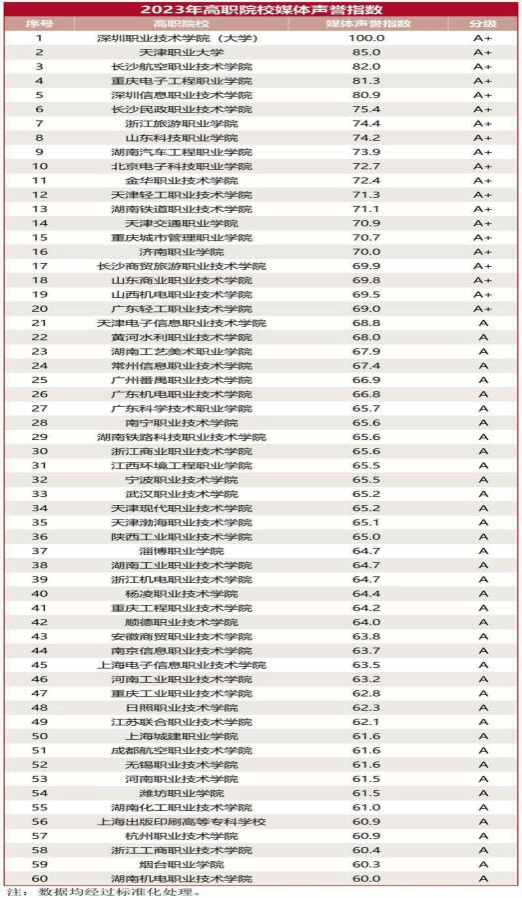 上图为2023年高职院校媒体声誉总指数前60名,由中国人民大学评价研究中心供图
