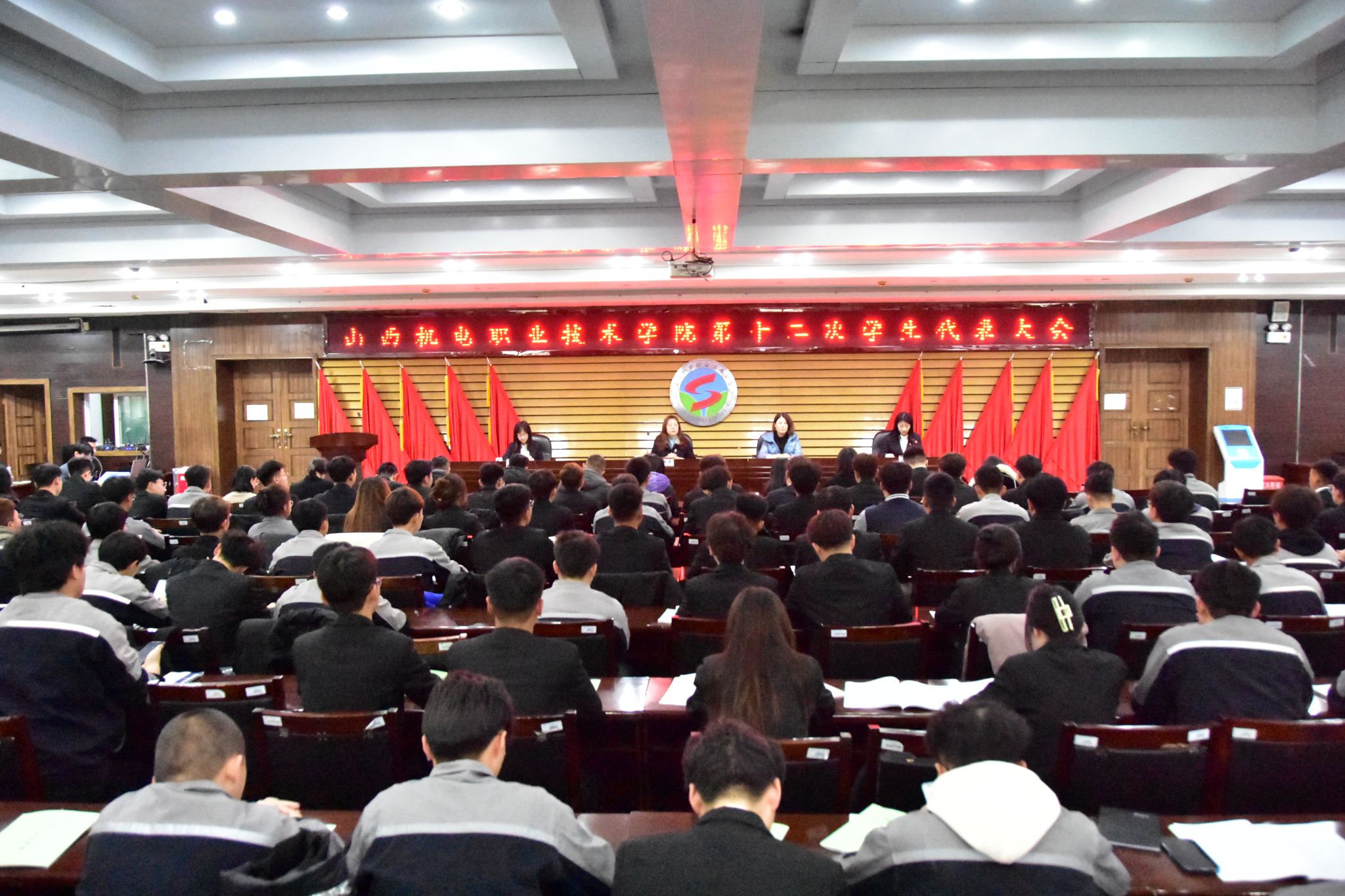 12月10日上午9:30,山西机电职业技术学院第十二次学生代表大会开幕式暨第一次全体会议在主校区图书馆六层报告厅召开,院党委委员、副院长李粉霞、学工部部长及宣传部副部长出席大会,各系分团委书记、团委干事以及124名学生代表参加大会。大会由院团委副书记赵艳主持。