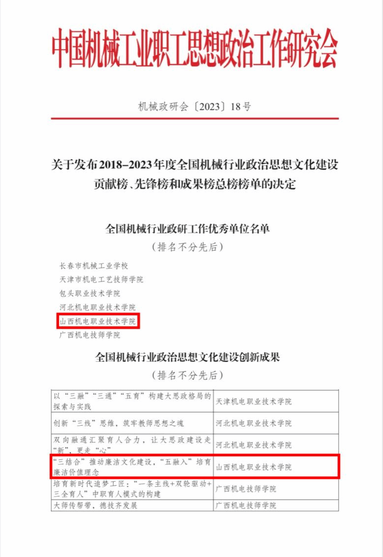 2018-2023年度全国机械行业政治思想文化建设贡献榜、先锋榜和成果榜总榜榜单集中反映了相关单位和个人在行业政治思想文化建设中所取得的卓越成绩。学院本次获评全国机械行业政研工作优秀单位,彰显了学院在持续推进政治思想文化建设,坚持方向引领、理论武装、铸魂立德、队伍建设等方面作出的不懈努力及取得的突出成绩。