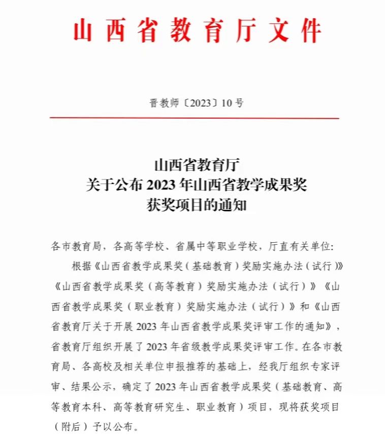 山西省教育教学成果奖每两年评审一次,旨在奖励在教学实践、改革研究中取得显著成果的单位和个人,发挥教学成果的引领示范作用,是我省教育领域最高层次的奖励。