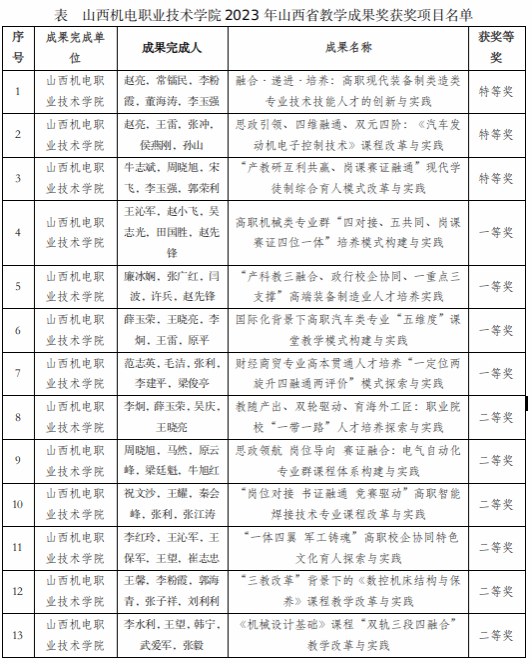 近日,山西省教学成果奖获奖项目公布,我院推荐的13个教学成果全部获奖,其中特等奖3项、一等奖4项、二等奖6项,获奖总数在职业教育中为全省第一。