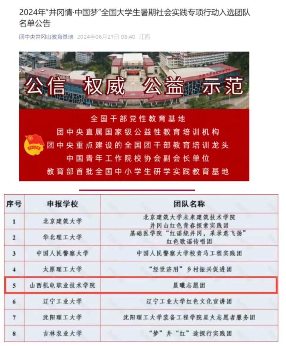 近日,团中央青年发展部、全国青少年井冈山革命传统教育基地管理中心公布了2024年“井冈情·中国梦”全国大学生暑期社会实践专项活动入选名单,我院数控工程系晨曦志愿团成功入选。