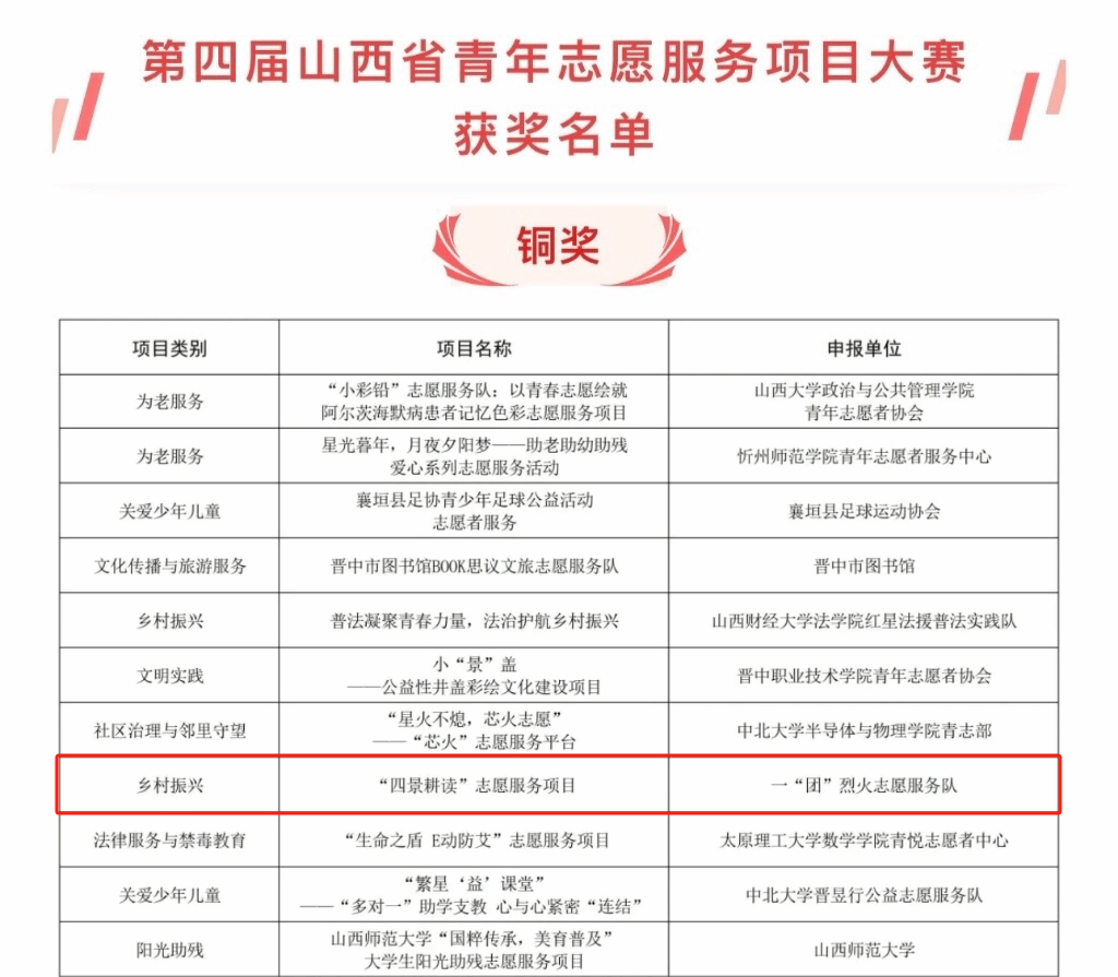 近日,第四届山西省青年志愿服务项目大赛和第四届山西省青年志愿服务公益创业赛公布获奖名单。我院经贸管理系一“团”烈火志愿服务队“四景耕读”志愿服务项目荣获第四届山西省青年志愿服务项目大赛铜奖!据悉,仅有两所高职院校在本次大赛中获奖。我院首次参与就荣获铜奖,不仅是学院青年志愿工作的新突破,更是我院在实践创新人才培养方面的重要成果。