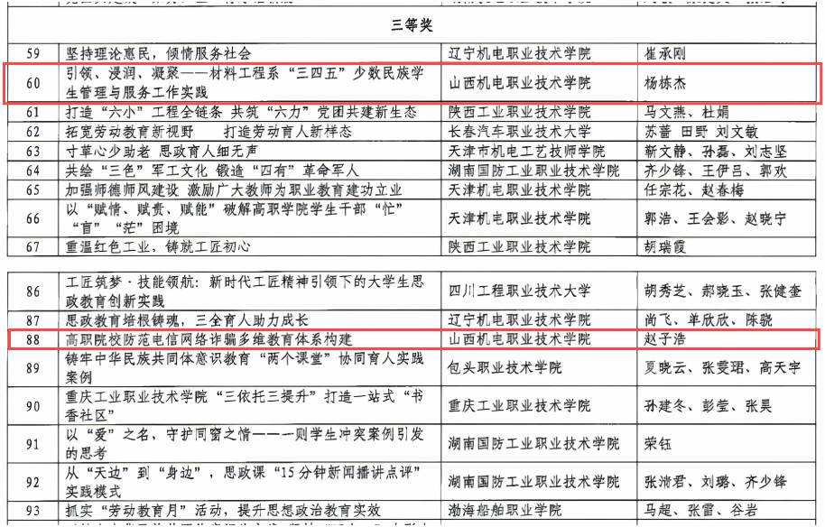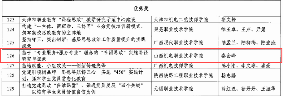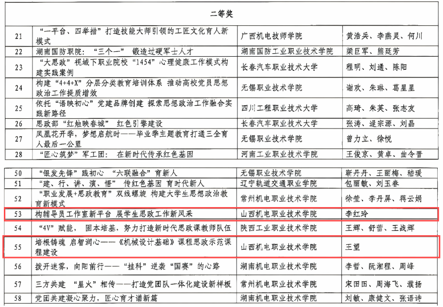 近日,中国机械政研会机械职教政研分会公布2024年度全国机械行业职业教育思想政治工作优秀案例遴选结果,我院共有5个案例获奖,其中二等奖2项,三等奖2项,优秀奖1项。