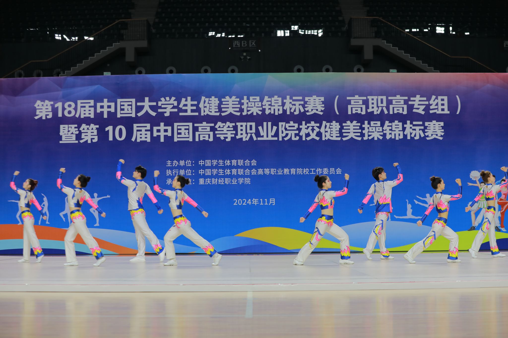 比赛期间,来自全国各地的高职高专院校的健美操队云集,参赛队伍实力相当,竞争异常激烈,评委对动作创意、团队配合、艺术表现等多个方面的要求极为严格。赛场上,我校运动健儿不惧艰难、敢于拼搏,充分展示了山西机电学子朝气蓬勃、青春活力的精神风貌和昂扬向上的进取精神,他们用汗水和努力诠释了青春力量,用团结和合作展现了体育精神。他们的协调性、灵活性、整齐度在光与影中交织升腾,共同绘就了一幅荣耀与激情交织的画卷,这就是力与美的完美表达!