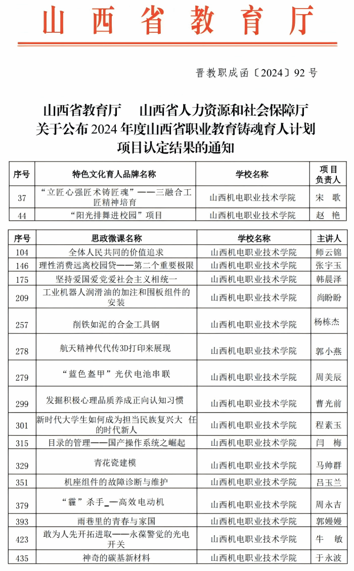 近日,山西省教育厅、山西省人力资源和社会保障厅公布2024年度山西省职业教育铸魂育人计划项目认定结果,我院《“立匠心 强匠术 铸匠魂”——三融合工匠精神培育》等2个项目被认定为省级职业教育特色文化育人品牌,《全体人民共同的价值追求》等16个微课被认定为省级职业教育思政微课。