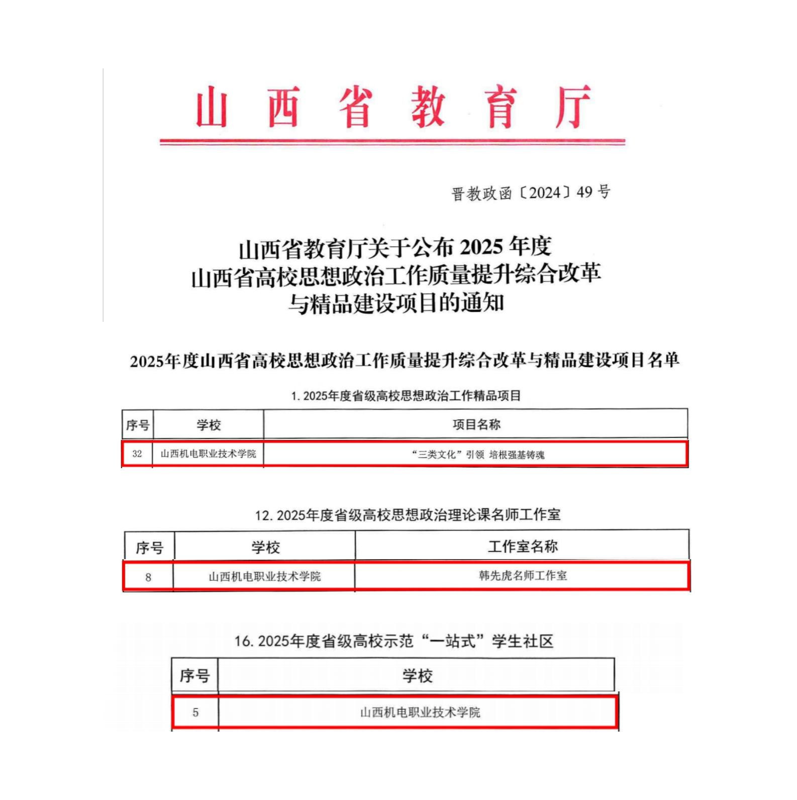 2025年度山西省高校思想政治工作质量提升综合改革与精品建设项目评选前期经高校申报、资格审核、专家评审等程序,省内本专科院校共计35个项目获评2025年度省级高校思想政治工作精品项目,25个工作室获评2025年度省级高校思想政治理论课名师工作室,7个“一站式”学生社区获评2025年度省级高校示范“一站式”学生社区。