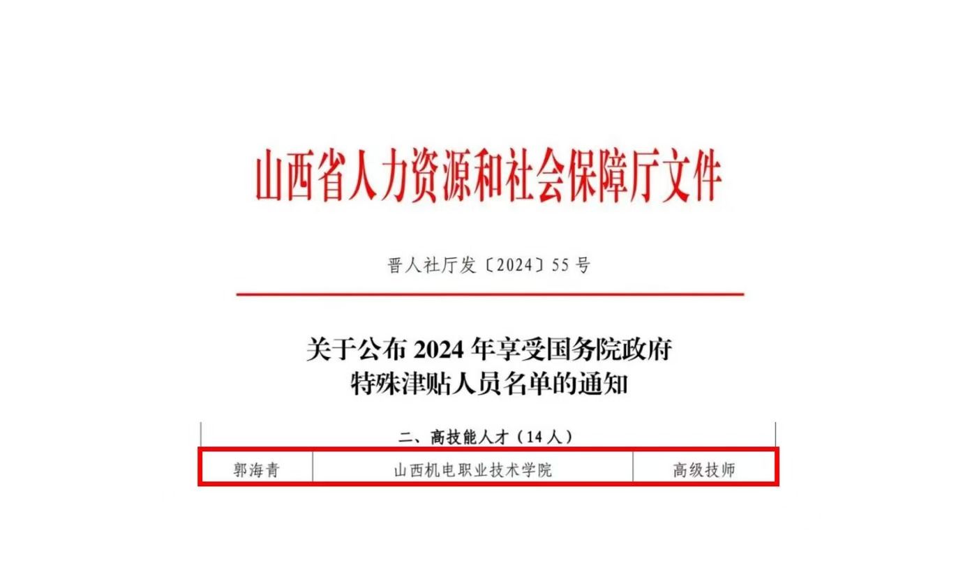 近日,山西省公布2024年享受国务院政府特殊津贴人员名单,全省共有59人为享受国务院政府特殊津贴人员,其中专业技术人才45人,高技能人才14人,我院数控工程系教师郭海青作为高技能人才入选享受国务院政府特殊津贴人员名单。