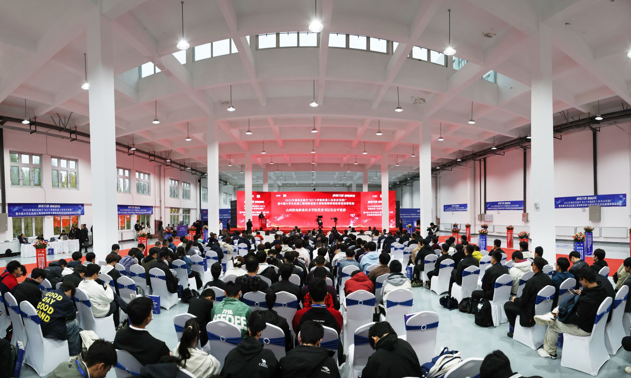 宋志平在开幕式上讲话,他指出,山西机电职业技术学院作为国家“双高”建设院校,始终围绕国家战略、产业需求,深入推进产教融合与校地合作。襄垣县作为长治市高质量发展的重要板块,在产业智能化升级方面取得了积极进展,特别是在机器人技术应用和低空经济领域展现出独特优势。本次大赛不仅是各方深化区域协作、共谋产教融合的契机,更是精准对接区域产业智能化升级、构建政行企校协同发展新格局的重要举措。学院将充分发挥在专业资源和技术团队方面的优势,与各合作企业紧密配合,在场地保障、技术服务等方面提供全方位支持,确保大赛各项活动顺利开展。