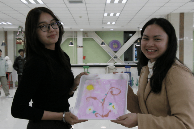 活动现场氛围热烈而温馨,提前布置了富有中式韵味的体验空间,并搭配传统音乐营造沉浸式氛围。活动开始前,指导老师细致讲解了技艺要领,代表团的同学们饶有兴致地围在桌旁,尝试滴色、吹染、拓印等步骤。当素色丝巾在斑斓色彩的装点下呈现出精美纹理时,外籍友人无不惊叹于中华非遗技艺的神奇与美妙。
