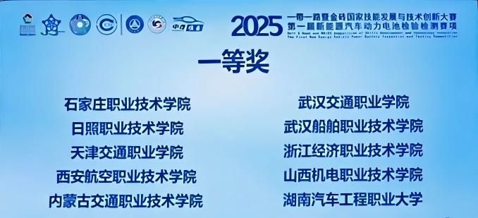 11月22日-25日,2025年一带一路暨金砖国家技能发展与技术创新大赛第一届新能源汽车动力电池检验检测赛项全国总决赛在石家庄职业技术学院成功举办。我院汽车工程系王雷、李吉浪两位教师组成的代表队发挥出色,在全国百余支参赛队伍中脱颖而出,成功斩获全国一等奖。