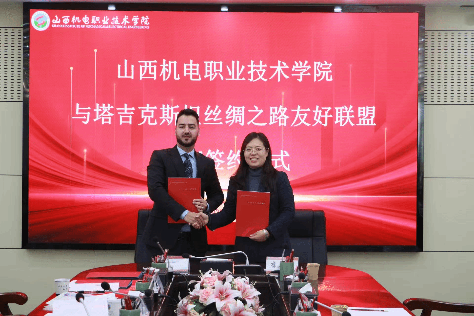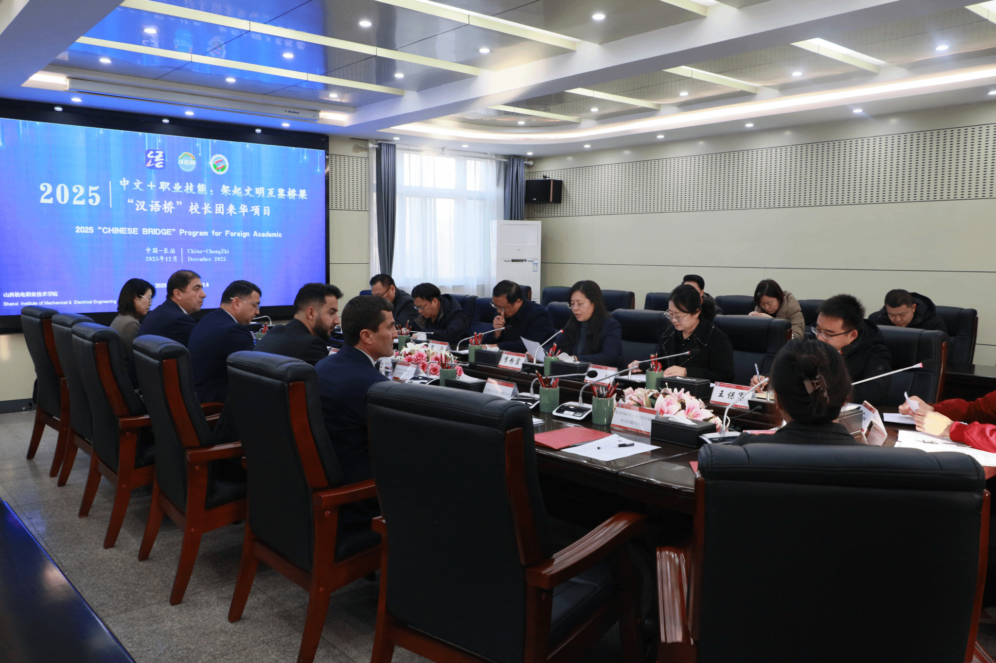 12月5日上午,“汉语桥”来华伙伴计划职业教育合作交流会议在我院举行。学院党委书记宋志平,党委委员、副院长李粉霞以及相关系部主任等人与塔吉克斯坦校长团围绕职业教育发展、境外办学、课程共建、师生互访等议题展开对话,双方签署了MoU,表示将深入探索未来合作路径。会后,代表团参与了工业机器人现场编程、中国传统文化互动体验活动。