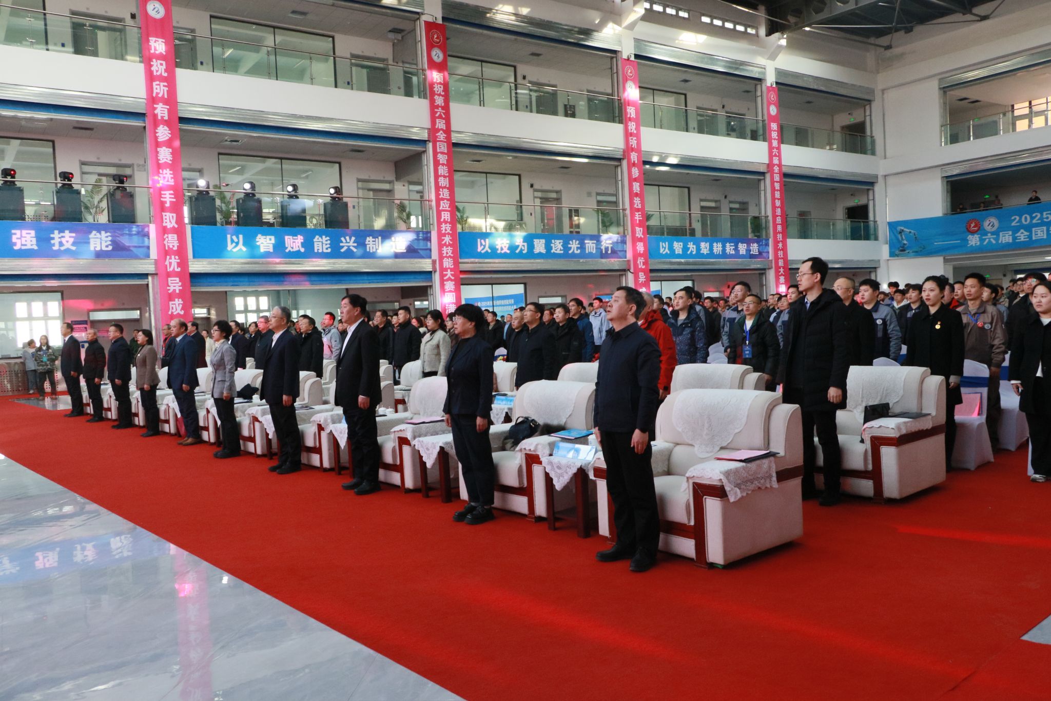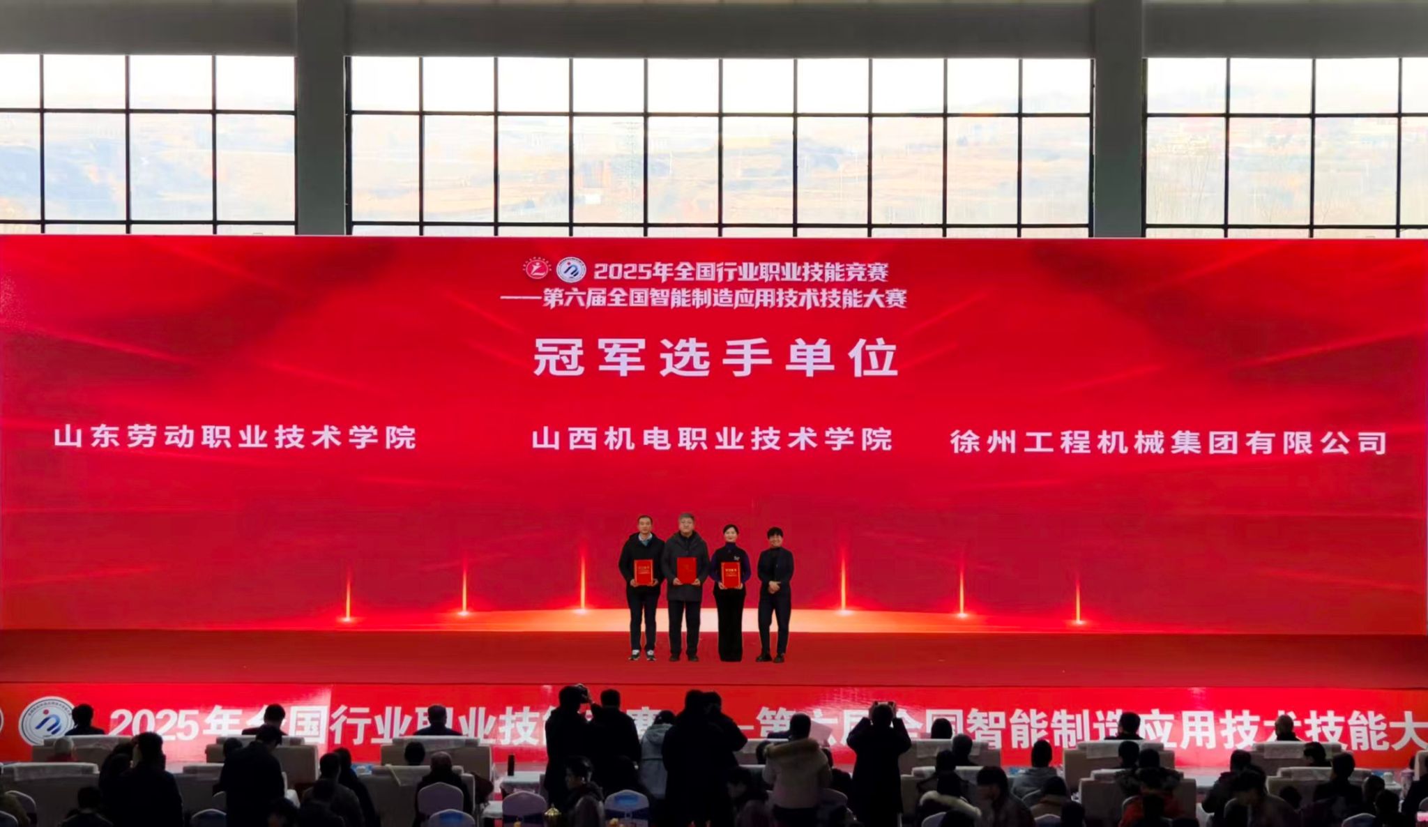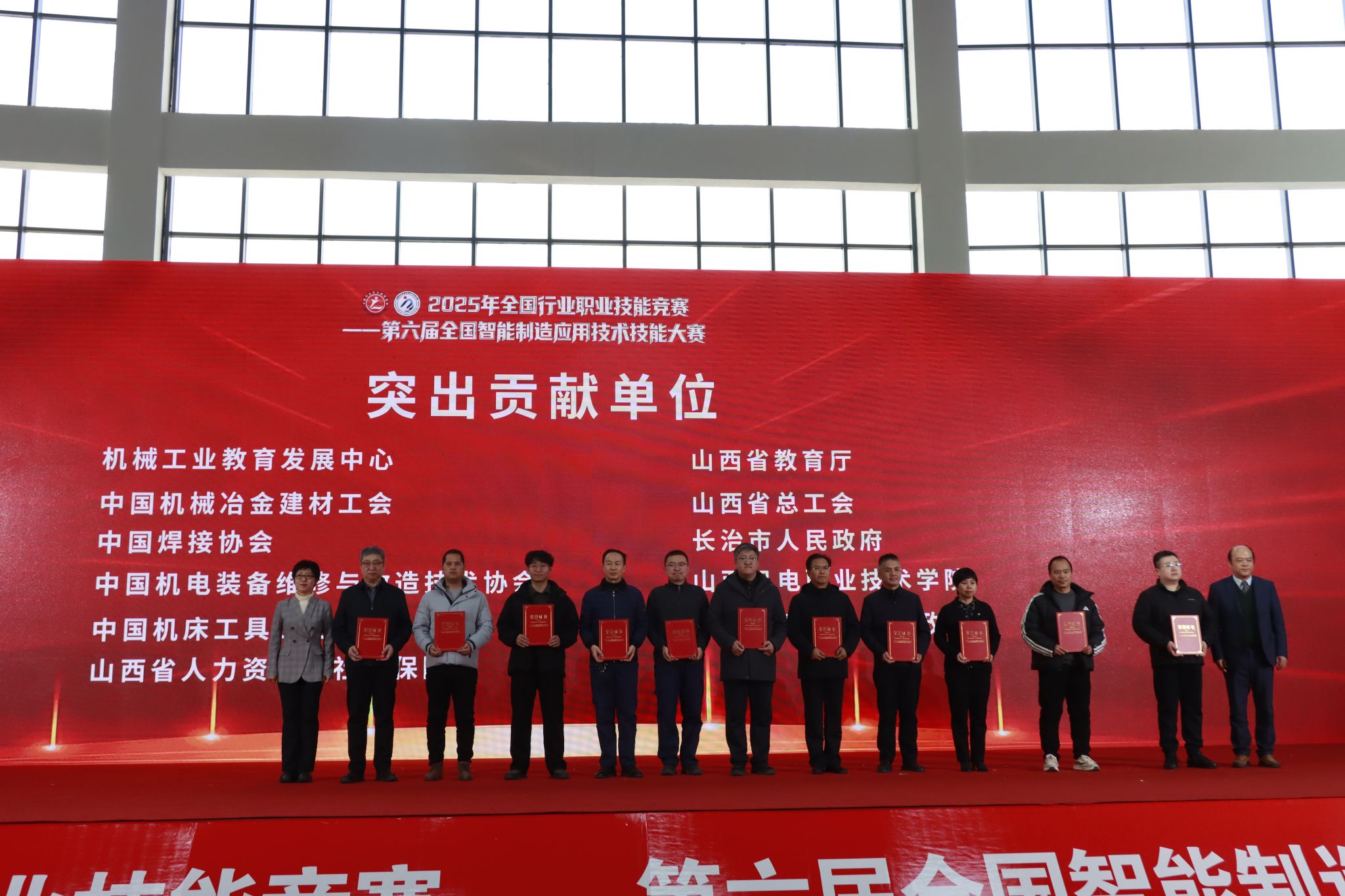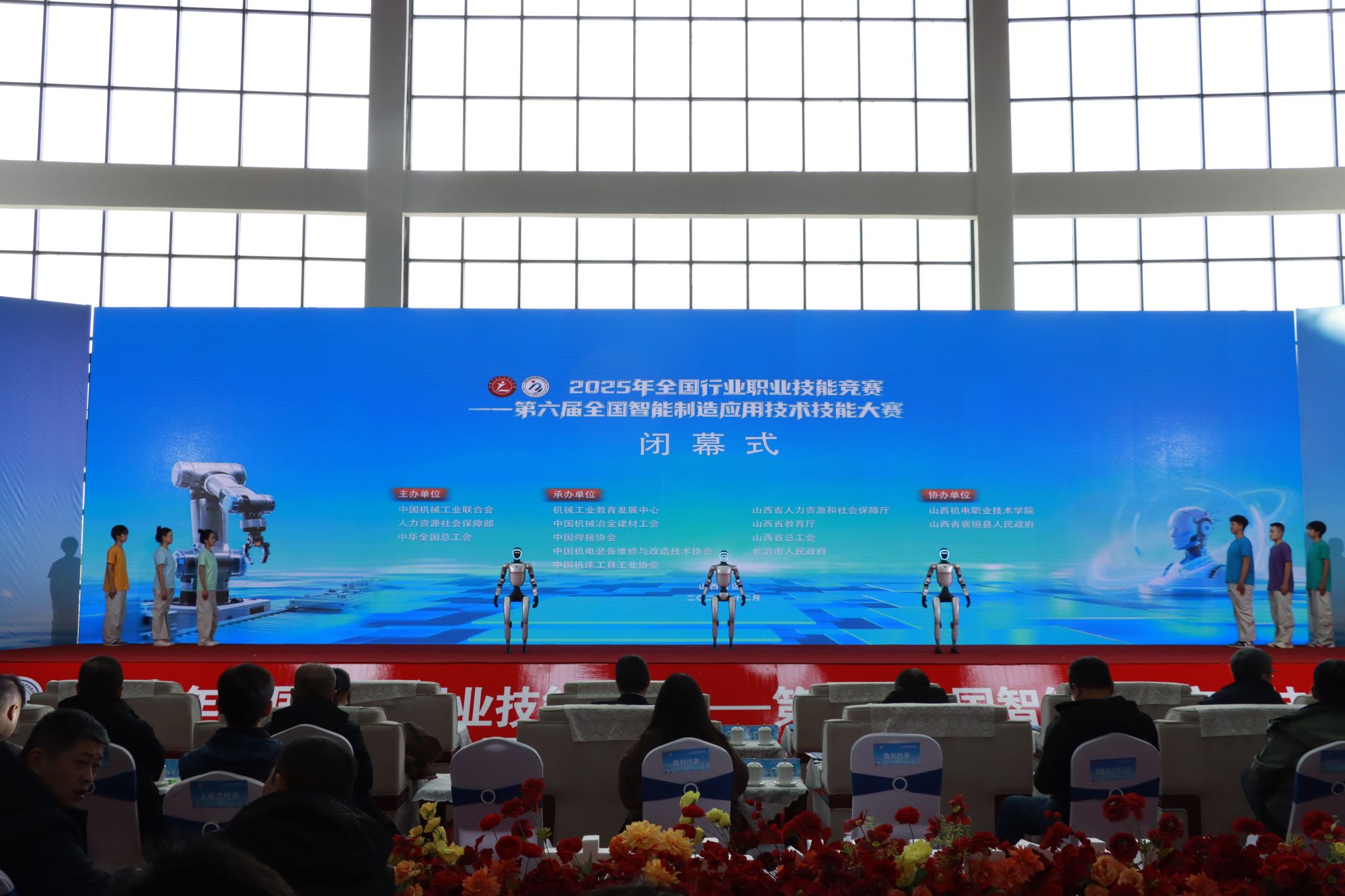 12月26日下午,2025年全国行业职业技能竞赛——第六届全国智能制造应用技术技能大赛山西赛区决赛闭幕式在我院东湖校区举行。中国机械工业联合会党委常委、副会长李奇,中国机械冶金建材工会主席李睿祎、冶金工作部部长王欣、机械工作部二级调研员张鲁玉,机械工业教育发展中心主任郑丽梅、副主任刘加勇,中国机电装备维修与改造技术协会秘书长李英勋,山西省总工会一级巡视员、山西省机械冶金建材工会联合会主席曲剑午,山西省人力资源和社会保障厅职业能力建设处一级调研员郜军,山西省教育厅二级巡视员徐岩章,长治市人大常委会副主任、市总工会主席于川,长治市政协副主席、市工商联主席赵文栋,襄垣县委副书记、县长段联刚,山西机电职业技术学院党委书记宋志平等有关领导及嘉宾出席闭幕式。参赛选手、专家、裁判、领队、教练、合作企业代表及媒体记者等共500余人参加闭幕式。