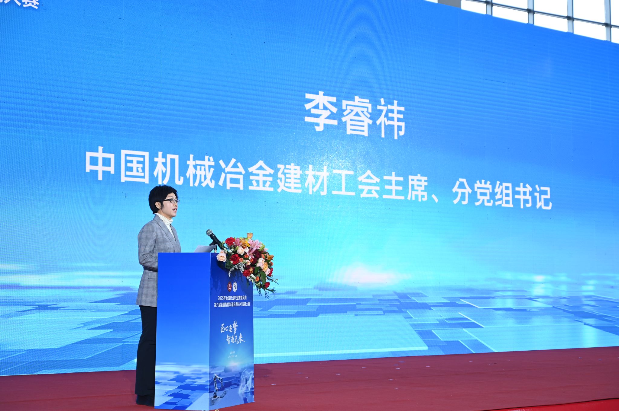 李睿祎代表中国机械冶金建材工会在闭幕式上讲话。她讲到,自2017年首届全国智能制造应用技术技能大赛举办以来,数万名选手在省级选拔中展现风采,4000多名精英挺进全国决赛,涌现出一批“全国技术能手”和“全国五一劳动奖章”获得者。这不仅彰显了智能制造领域人才培育的丰硕成果,同时印证了技能报国之路的广阔前景。她强调,未来工作要把思想和行动统一到党中央决策部署上来,引导职工为“十五五”开好局、起好步发挥主力军作用;要持续深化产业工人队伍建设改革,为加快发展新质生产力、推动高质量发展提供人才支撑;要推动各层级各行业劳动和技能竞赛提质扩面,动员激励广大职工立足岗位创新创造。她号召全体选手以此次大赛为新起点,将精湛技艺转化为岗位建功的实际行动,为加快建设制造强国、谱写中国式现代化新篇章作出更大贡献!