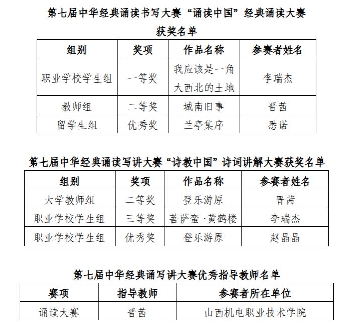今年的中华经典诵写讲大赛参赛规模超2000万人次,共有547万余件作品入围初赛,经复赛和决赛,共评选出获奖作品10290件。其中,“诵读中国”经典诵读赛项竞争激烈,历经层层选拔,最终仅335件优秀作品获邀参与线下总决赛。2025年8月,诵读大赛总决赛在浙江杭州举行,我院学生李瑞杰成功入围,与来自全国各地的参赛选手同台竞技。他在现场诵读中感情饱满真挚、表达流畅自然,凭借对作品的深刻理解与出色演绎,获得职业学校学生组一等奖,成为该组别山西赛区唯一获此殊荣的选手。