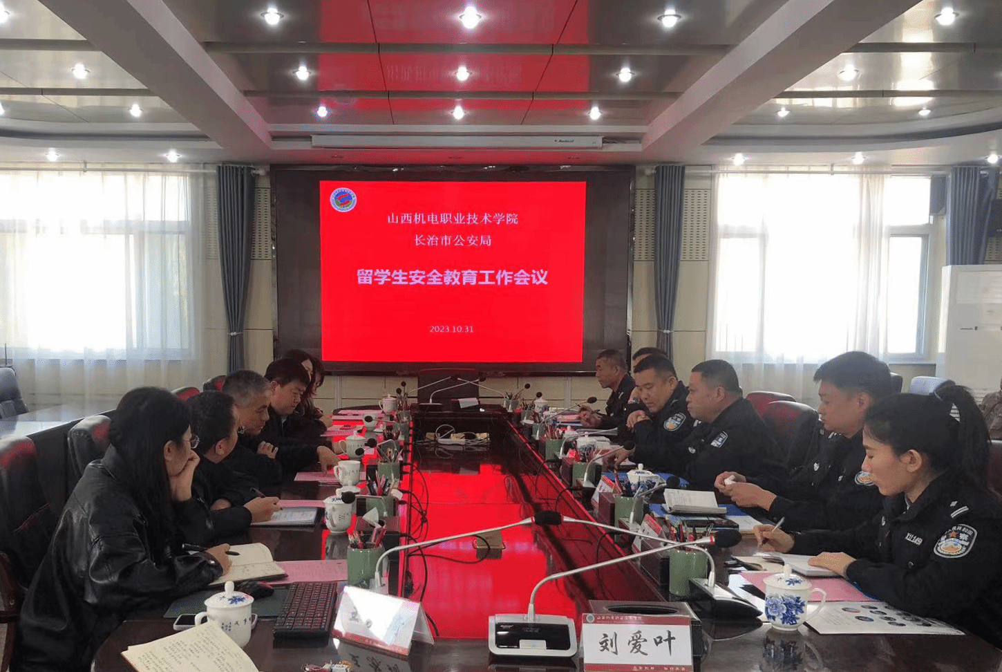 2023年10月31日上午,长治市潞洲区公安局副局长宋志斌、警官王晶晶、出入境管理局科长韦志海和太东派出所所长李永亮、民警牛强、杨茂来我院为留学生开展安全教育工作。副院长李军、教务部部长薛玉荣、学工部部长李红玲、后勤部部长李新、纪检监察机构张杰、教务处(国际交流教育部)李炯、王苏琦以及在校留学生参会。