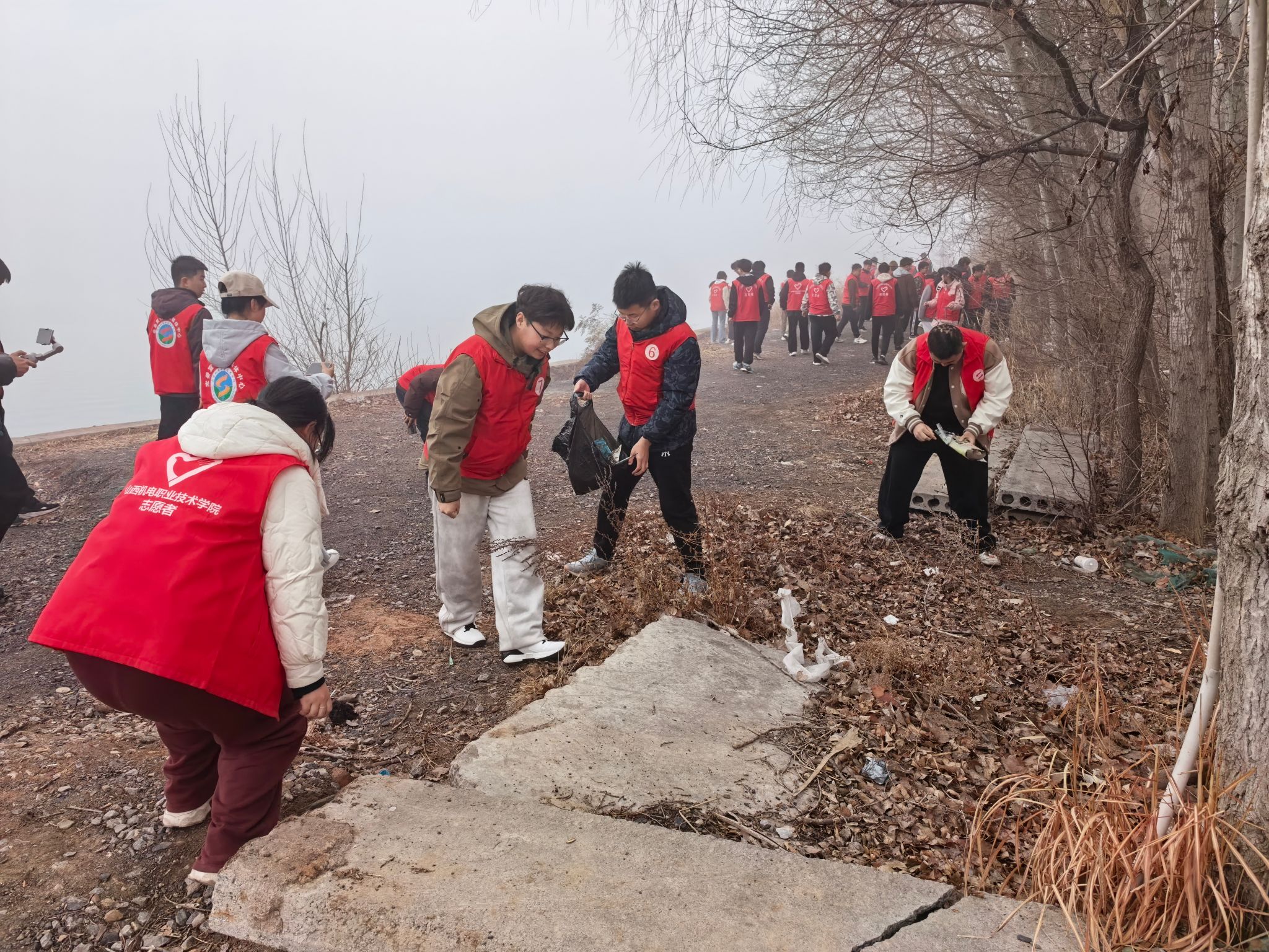活动当日,身着红色志愿服的学生们分成多个小组,携带各种清洁工具,沿漳泽湖展开清理,重点清除烟蒂、废纸、塑料瓶等垃圾。尽管春寒料峭,但学生们的热情丝毫未减,大家干劲十足,不放过任何一个卫生死角。