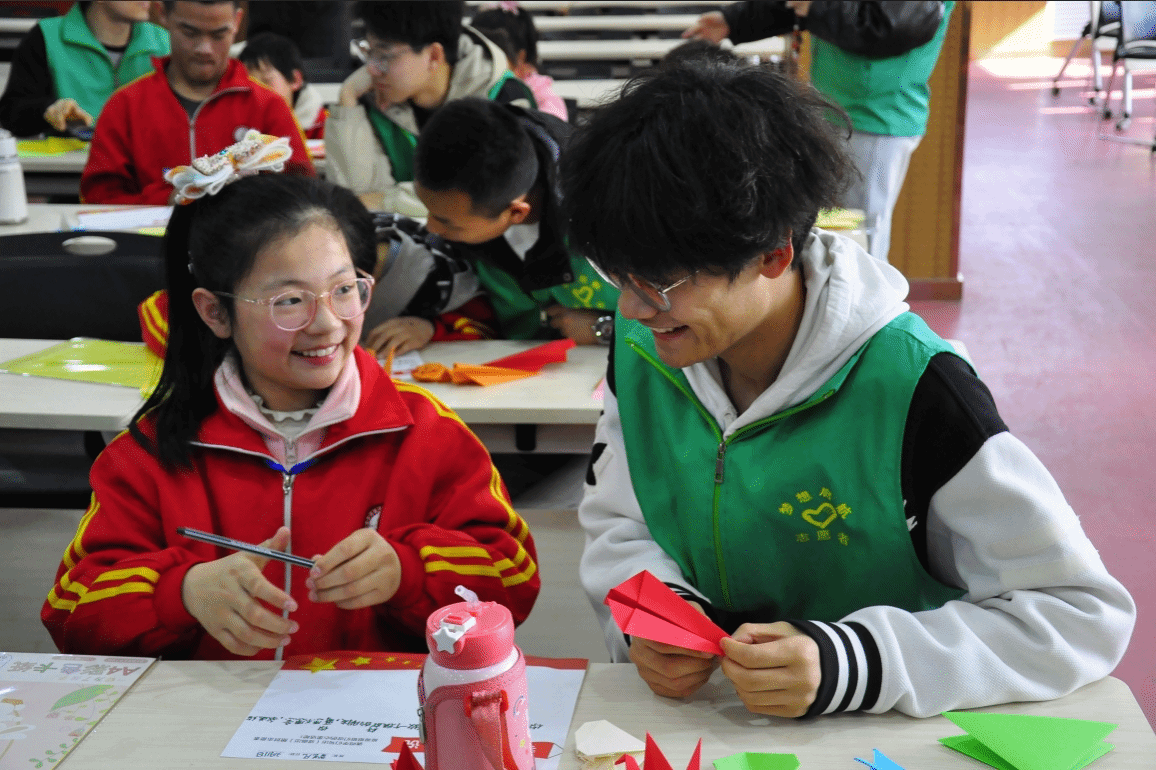 教室里,汽车工程系“暖扳手”们俯身于课桌间,用指尖与孩子们在彩纸上交织出对话,他们与特校孩子们一同折纸、绘画,共享创作的喜悦。志愿者们的温暖笑容与孩子们眼中喜悦的光芒充斥着整间教室。一张张绘画、一只只千纸鹤,见证了志愿者们的关爱,也映照着孩子们纯真的笑容与创造力。