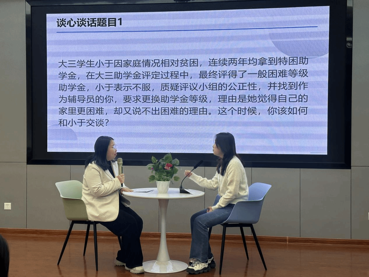 决赛设置自我工作展示、案例研讨、谈心谈话三个核心环节,全方位考察辅导员的理论素养、业务能力与育人水平。自我工作展示环节中,参赛辅导员结合 PPT、视频等素材,生动呈现个人工作特色与育人成果,展现出鲜明的工作风格与饱满的职业热情;案例研讨环节中,选手现场围绕案例辨析原因、研讨对策,提问精准犀利,作答逻辑清晰,凸显了应急处突与解决实际问题的能力;谈心谈话环节模拟真实场景,现场通过情景再现开展引导沟通,展现了对学生成长规律的把握与教育引导的专业技巧。