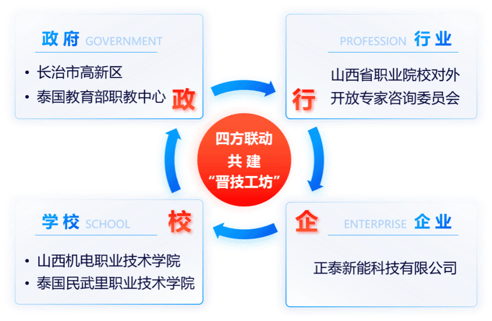 1.政校企行协同推进:①在长治市高新区、泰国教育部职教委支持下,联合泰国民武里技术学院、正泰新能科技(泰国)共建“晋技工坊”,形成“政府政策引导、院校资源输出、企业需求对接、行业标准支撑”协同机制。②牵头成立山西省职业院校对外开放专家咨询委员会,统筹省内院校资源协同“走出去”。