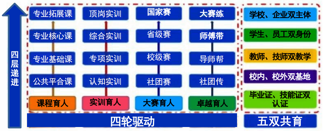 1.五双共育:构建“双主体办学、双导师教学、双标准考核、双基地实训、双身份成长”育人体系,联合航天科工二院、太重集团等龙头企业,开发"基础-核心-综合-岗位"四层递进课程体系,融入"1+X"证书标准与课程思政。